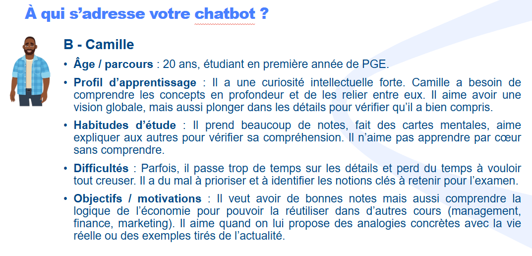 Avoir des formateurs, issus de l’entreprise, qui challengent en direct les étudiants sur leur esprit critique, sur la pertinence d’utiliser l’IAg ou pas, sur la manière de l’intégrer dans leurs apprentissages était une partie essentielle de la pédagogie choisie. De nombreuses activités de groupe ont été développées, proches de leurs préoccupations.